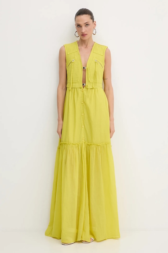 - Модель макси длины. - Приталенный верх и свободный низ. - Острый вырез. - Застежка на пуговицы. - Модель без рукавов. - Дополнительный слой материала в виде подкладки. - Два нагрудных кармана на молнии. - Длина: 156 см. - Ширина под мышками: 43 см. - Размеры указаны для размера: 40.