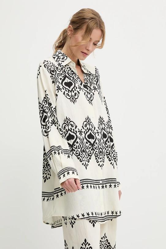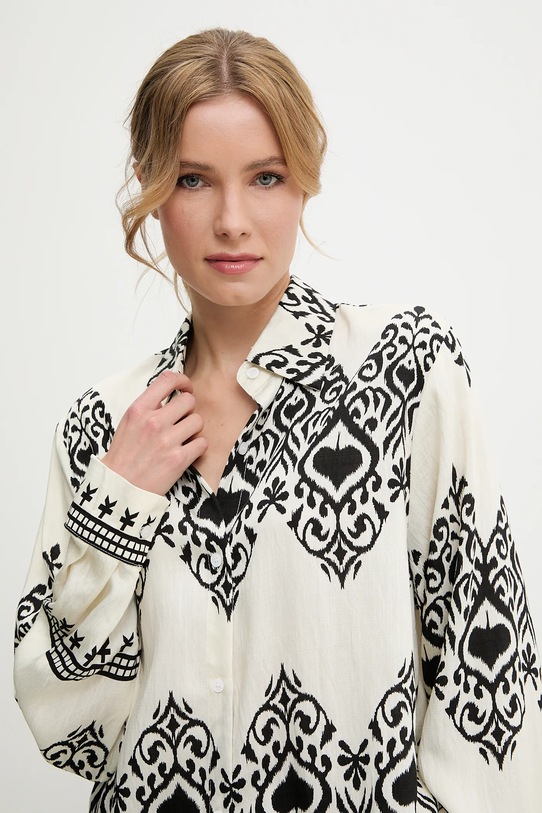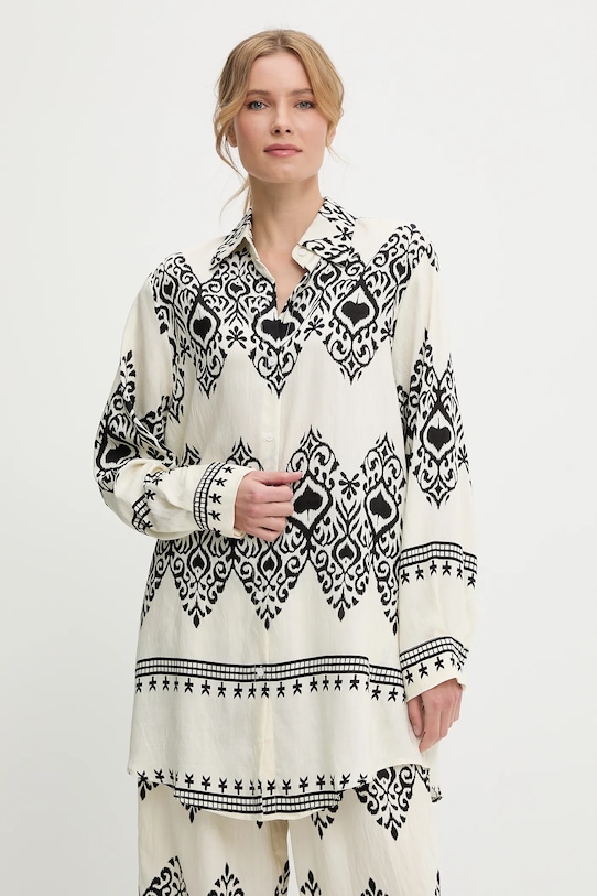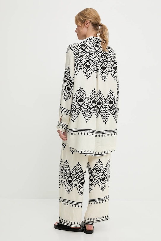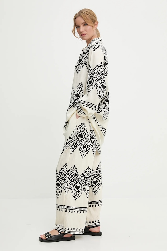Рубашка и брюки Answear.LAB изготовлены из тонкой, неэластичной ткани. Полиэстер обеспечивает повышенную устойчивость к сминанию. - Свободный крой, обеспечивающий полную свободу движений. - Длинный рукав. - Крой рукава со спущенной линией плеча не ограничивает подвижность. - Модель с воротником. - Удобная застежка на кнопки позволяет легко надевать и снимать. - Брюки свободные в области бедер и ягодиц. - Прямая нога полной длины. - Высокая талия с резинкой предотвращает скольжение во время движения. - Два боковых накладных кармана. - Ширина талии: 35 см. - Ширина бедер: 60 см. - Высота талии: 32 см. - Ширина штанины внизу: 29 см. - Ширина штанины: 37 см. - Длина внешней части штанины: 104 см. - Длина рубашки: 88 см. - Ширина под мышками: 63 см. - Указаны размеры: S/M.