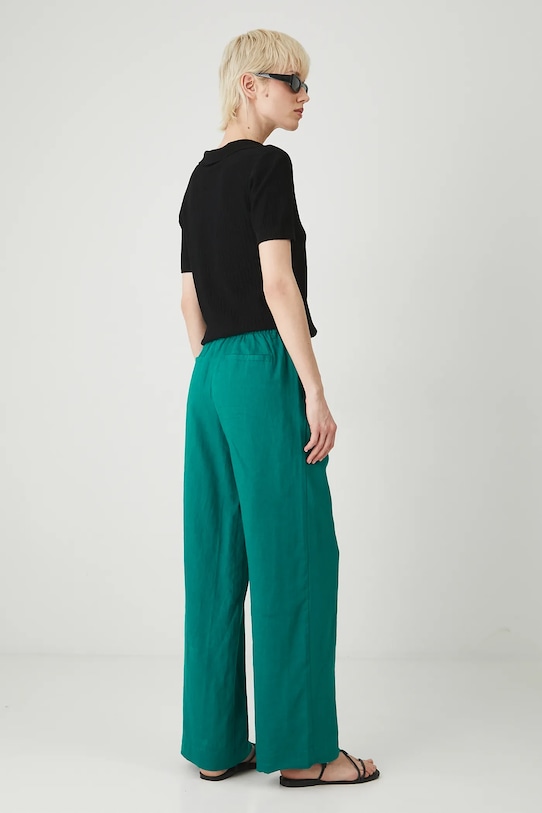 Брюки из коллекции «Медицина». Изготовлены из льняного материала. - Материал с сертификатом OEKO-TEX Standard 100 гарантирует, что текстильные изделия, на которых он нанесен, не содержат вредных и потенциально опасных для человека и окружающей среды веществ. - Натуральный, воздушный и прочный материал, изготовлен из 100% льна. - Широкий фасон штанины. - Модель со стандартной талией, застежкой на пуговицы и молнию. - Эластичная резинка сзади. - Накладные карманы. - Декоративные закладки. - Широкие штанины. - Гладкая ткань. - Ширина талии (до растягивания): 37,5 см. - Ширина талии (после растяжения): 43 см. - Ширина бедер: 53 см. - Высота талии: 28,5 см. - Ширина штанины внизу: 29,5 см. - Длина внешней части штанины: 80 см. - Размеры указаны для размера: S.