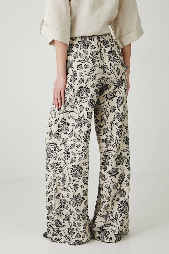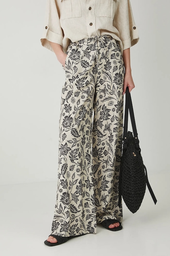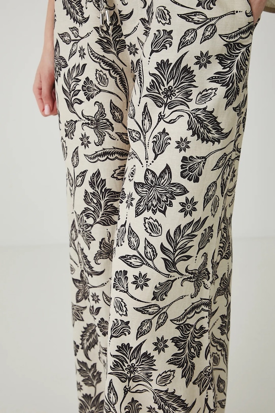 Брюки из коллекции «Медицина». Изготовлены из узорчатой ткани. - Материал с сертификатом OEKO-TEX Standard 100 гарантирует, что текстильные изделия, на которых он нанесен, не содержат вредных и потенциально опасных для человека и окружающей среды веществ. - Материал с добавлением льна обеспечивает комфорт и воздухопроницаемость. - Широкий фасон штанины. - Обхват талии обычный. - Эластичный пояс со шнурками. - Два боковых накладных кармана. - Широкие штанины. - Узорчатая ткань. - Узор с растительным мотивом. - Ширина талии (до растягивания): 37,5 см. - Ширина талии (после растяжения): 46 см. - Ширина бедер: 50,5 см. - Высота талии: 27,5 см. - Ширина штанины внизу: 36 см. - Длина по внутреннему шву: 80 см. - Размеры указаны для размера: S.