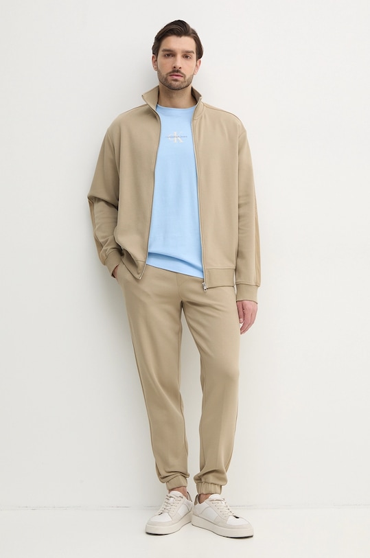 Эти спортивные брюки из коллекции Calvin Klein Jeans изготовлены из эластичного трикотажа. Они изготовлены из исключительно комфортного материала с высоким содержанием хлопка. - Экологически чистый переработанный хлопок снижает воздействие на окружающую среду за счет сокращения использования химикатов и экономии воды и энергии, улучшая условия жизни и экономическое развитие в регионах производства хлопка. - Обычная посадка. - Эластичный пояс со шнурками. - Два накладных кармана спереди. - Ножки отделаны удобными эластичными манжетами. - Ширина талии: 40 см. - Ширина бедер: 52 см. - Высота талии: 31 см. - Ширина штанины внизу: 12 см. - Ширина штанины: 30 см. - Длина внешней части штанины: 102 см. - Размеры указаны для размера: M.