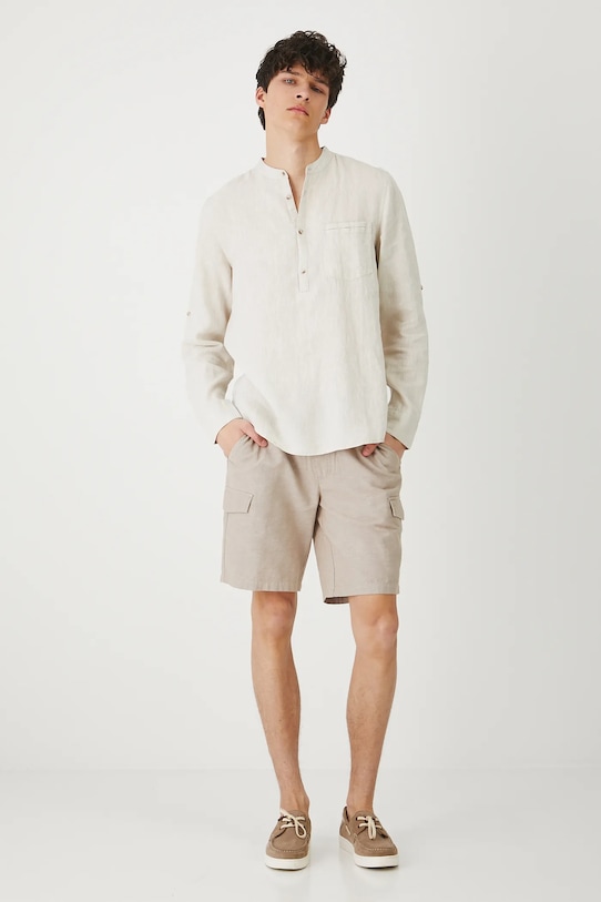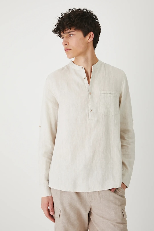 Рубашка из коллекции «Медицина». Изготовлена из льняной ткани, с воротником-стойкой. - Натуральный, воздушный и прочный материал, изготовлен из 100% льна. - Рубашка прямого кроя мягко облегает фигуру, но не подчеркивает ее, обеспечивая свободу движений. - Длинный рукав. - Манжеты на пуговицах. - Благодаря легко подворачивающимся рукавам их можно укоротить до 3/4 длины, что делает модель практичной в переменчивую погоду. - Модель с воротником-стойкой. - Короткая планка с пуговицами. - Нагрудный карман застегивается на пуговицу. - Меланжевая ткань. - Ткань с неровной текстурой. - Длина рукава: 67 см. - Длина: 75,5 см. - Ширина груди: 55,5 см. - Ширина плеч: 46 см. - Размеры указаны для размера: M.