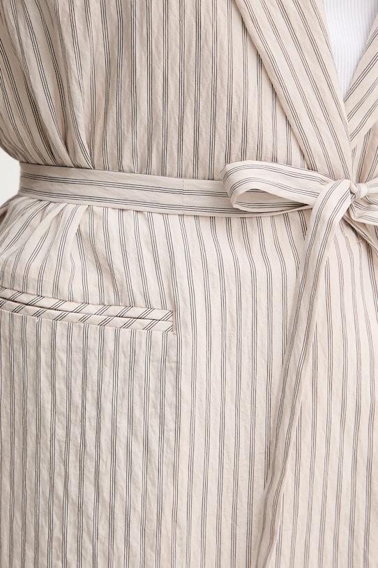 - Простой дизайн, не стесняющий движений. - Удобная застежка-кнопка позволяет легко надевать и снимать. - Классические лацканы. - Модель с воротником. - Длинный рукав. - Два накладных кармана спереди. - Текстильный ремешок в комплекте. - Модель без подкладки. - Длина: 70 см. - Ширина под мышками: 44 см. - Размеры указаны для размера: 36.