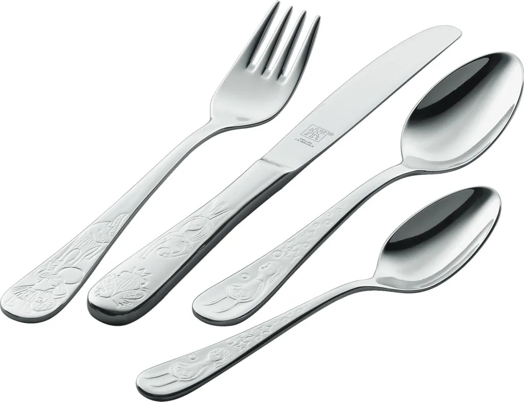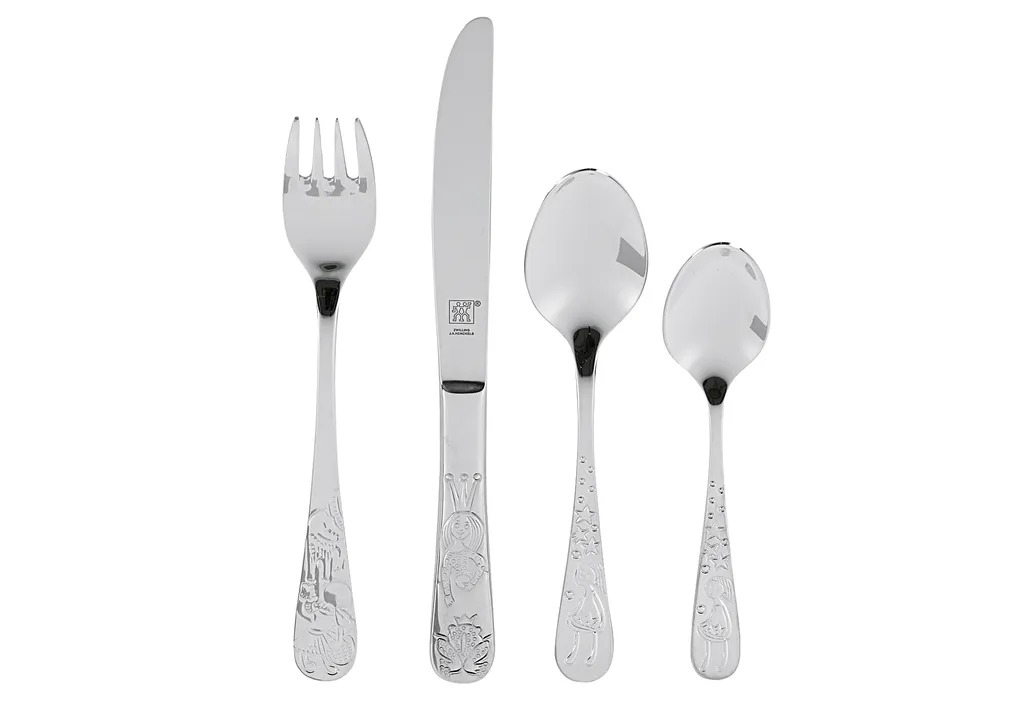 С детским набором столовых приборов из серии «Сказки братьев Гримм» от ZWILLING даже самые маленькие смогут пообедать стильно. Освоение ножа и вилки требует практики: рельефные изображения Царевны-лягушки, Красной Шапочки и Звездных денег в этом наборе помогают в этом. Столовые приборы, изготовленные из нержавеющей стали 18/10, подходят для детей от трех лет и специально разработаны для маленьких ручек. С этим детским набором из серии «Сказки братьев Гримм» вы можете, играя, научить малыша правилам поведения за столом, не опасаясь порезов, ведь зубчатый нож тупой и поэтому безопасен для детских рук.
