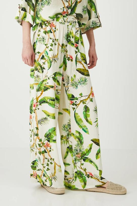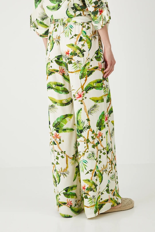 Брюки из коллекции «Медицина». Изготовлены из узорчатой ткани. - Материал с сертификатом OEKO-TEX Standard 100 гарантирует, что текстильные изделия, на которых он нанесен, не содержат вредных и потенциально опасных для человека и окружающей среды веществ. - Широкий фасон штанины. - Обхват талии обычный. - Эластичный пояс. - Ремешок в комплекте. - Накладные карманы. - Широкие штанины. - Узорчатая ткань. - Узор с растительными и животными мотивами. - Ширина талии (до растягивания): 37,5 см. - Ширина талии (после растяжения): 46,5 см. - Ширина бедер: 55 см. - Высота талии: 28,5 см. - Ширина штанины внизу: 36 см. - Длина по внутреннему шву: 80 см. - Размеры указаны для размера: S.