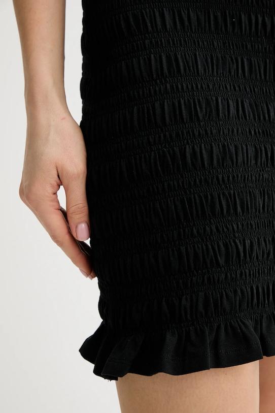 Это платье из коллекции Guess выполнено из тонкого, высокоэластичного трикотажа. Эта модель выполнена из исключительно комфортного и дышащего материала, идеально подходящего для теплого времени года. Этот продукт содержит модал TENCEL. Волокна модала TENCEL извлекаются из натуральной буковой древесины с использованием экологически чистого, энергосберегающего процесса, предполагающего переработку побочных продуктов переработки древесины. Это гибкое волокно славится своей исключительной мягкостью. - Приталенный крой с привлекательными оборками. - Короткие, пышные рукава. - Классический круглый вырез. - Модель без подкладки. - Длина: 91 см. - Ширина под мышками: 40 см. - Размеры указаны для размера: S.