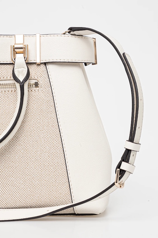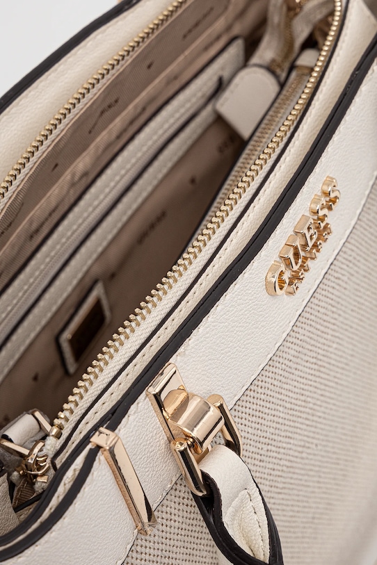 Сумка среднего размера из коллекции Guess. Модель на молнии выполнена из комбинации текстиля и искусственной кожи. - Застежка-молния. - Имеет три отделения, одно из которых застегивается на молнию. - Три внутренних кармана: один на молнии, два накладных. - Карман на молнии на задней стороне позволяет безопасно хранить телефон или другие мелкие предметы. - Модель на подкладке. - Не подходит для формата А4. - Имеет ручки и съемный регулируемый ремень. - Модель оснащена металлическими ножками, защищающими дно сумки. - В комплект модели входит брелок. - Входящий в комплект тканевый чехол защищает изделие от пыли. - Глубина: 9,5 см. - Высота: 23 см. - Ширина у основания: 32,5 см.