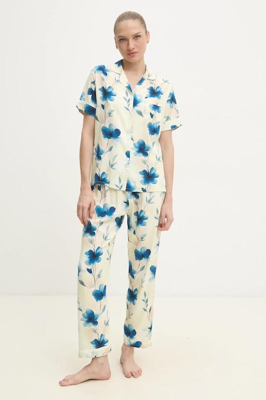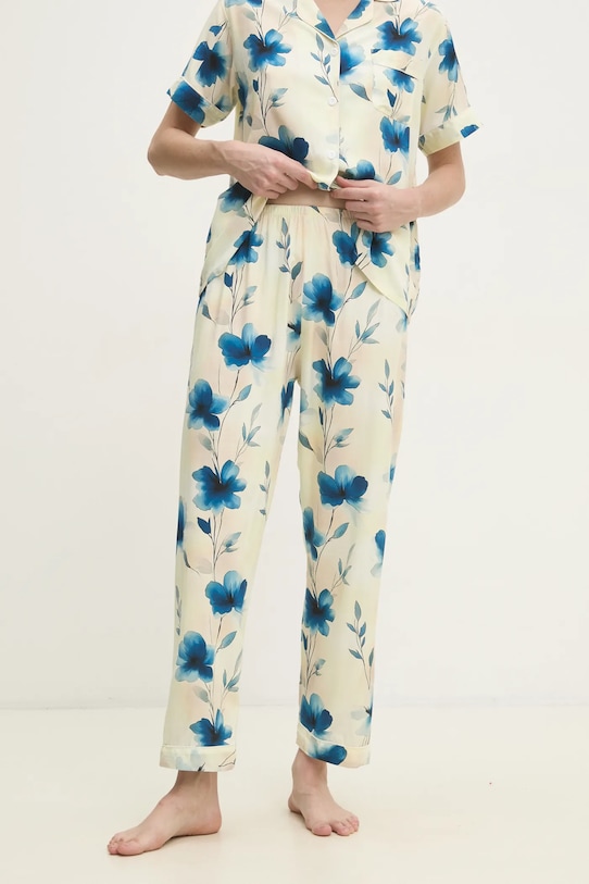 Пижама из коллекции Answear.LAB. Изготовлена из ткани с рисунком. Изготовлена из дышащего вискозного материала. - Пижама состоит из рубашки и брюк. - Свободный крой, обеспечивающий полную свободу движений. - Модель с воротником. - Короткий рукав. - Крой рукава со спущенной линией плеча не ограничивает подвижность. - Накладной карман на груди. - Удобная застежка на кнопки позволяет легко надевать и снимать. - Брюки свободные в области бедер и ягодиц. - Высокая талия обеспечивает комфорт во время занятий спортом и позволяет визуально стройнить фигуру. - Эластичный пояс предотвращает скольжение во время движения. - Прямая нога полной длины. - Тонкая, неэластичная ткань.