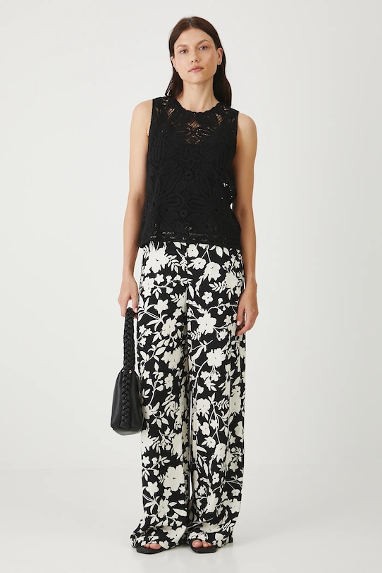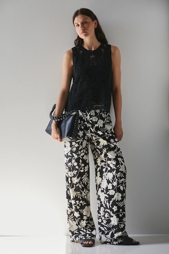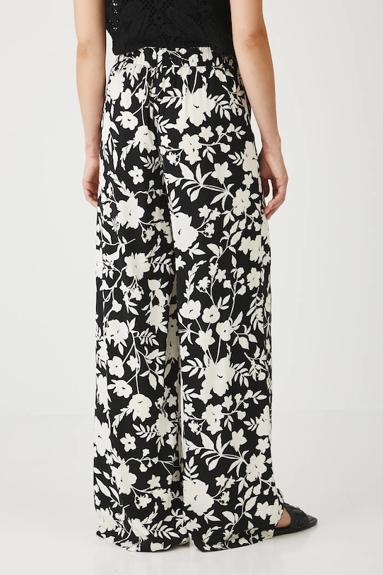 Брюки из коллекции «Медицина». Изготовлены из узорчатой ткани. - Материал с сертификатом OEKO-TEX Standard 100 гарантирует, что текстильные изделия, на которых он нанесен, не содержат вредных и потенциально опасных для человека и окружающей среды веществ. - Широкий фасон штанины. - Обхват талии обычный. - Эластичная резинка сзади. - Застежка на молнию и крючок. - Широкие штанины. - Узорчатая ткань. - Цветочный узор. - Ширина талии (до растягивания): 37 см. - Ширина талии (после растяжения): 45,5 см. - Ширина бедер: 50 см. - Высота талии: 30 см. - Ширина штанины внизу: 33 см. - Длина по внутреннему шву: 80 см. - Размеры указаны для размера: S.
