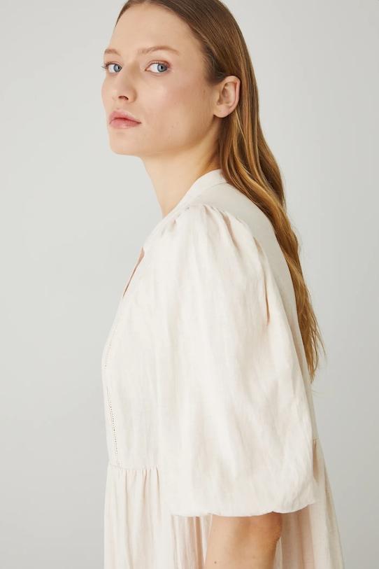 Платье из коллекции Medicine. Свободного кроя, выполнено из смеси льна и вискозы. - Материал с сертификатом OEKO-TEX Standard 100 гарантирует, что текстильные изделия, на которых он нанесен, не содержат вредных и потенциально опасных для человека и окружающей среды веществ. - Льняной материал обеспечивает комфорт и воздухопроницаемость. - Свободный покрой. - Рукав три четверти. - Рукава отделаны резинкой. - Острый вырез. - Короткая планка с пуговицами. - Модель с декоративными оборками. - Декоративные вставки. - Гладкая ткань. - Модель мини-длины. - Ширина груди: 51 см. - Ширина талии: 50 см. - Длина: 92 см. - Размеры указаны для размера: S.