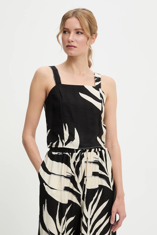 Блузка и брюки коллекции Answear.LAB выполнены из тонкой неэластичной ткани. Добавление полиамида обеспечивает повышенную прочность. - Прямой верх и свободный низ. - Алмазный вырез. - Нерегулируемые, несъемные лямки. - Эластичная вставка сзади. - Эластичный пояс и дополнительная регулировка ширины с помощью шнурков для предотвращения сползания во время движения. - Два боковых накладных кармана. - Длина: 46 см. - Ширина под мышками: 41 см. - Ширина талии: 33 см. - Ширина бедер: 60 см. - Высота талии: 34,5 см. - Ширина штанины внизу: 29,5 см. - Ширина штанины: 34,5 см. - Длина внешней части штанины: 104,5 см. - Указаны размеры: S/M.