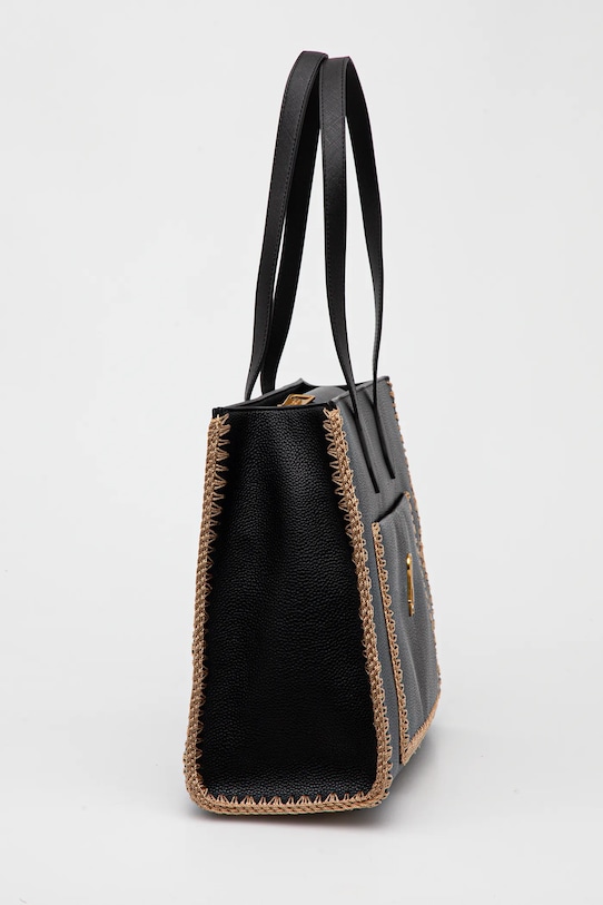 Большая сумка из коллекции Стива Мэддена. Изготовлена из экокожи, застёгивается на молнию. - Сумка для ношения в руке или на плече. - Длинные ручки. - Имеет три отделения, одно из которых застегивается на молнию. - Три внутренних кармана: один на молнии, два накладных. - Карман на магнитной застежке спереди позволяет безопасно хранить телефон и другие мелкие предметы. - Карман на молнии сзади. - Усиленное дно сумки позволяет изделию долго сохранять форму. - Модель оснащена металлическими ножками, защищающими дно сумки. - Вмещает формат А4. - В комплект входит чехол для переноски. - Ширина у основания: 44 см. - Высота: 29 см. - Глубина: 10 см.