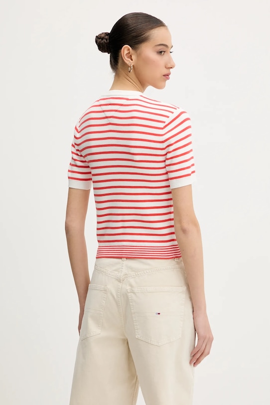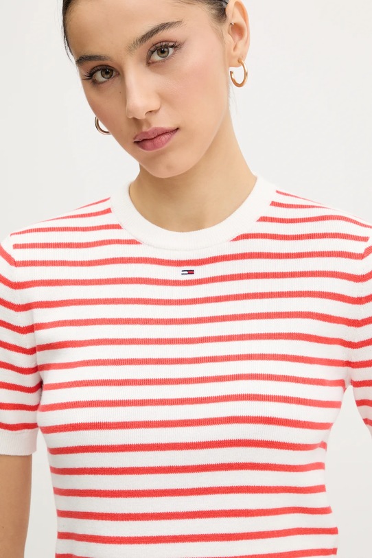 Этот свитер Tommy Jeans сшит из тонкого, эластичного трикотажа на основе дышащего хлопка. Модель частично построена из материалов, полученных в результате регенеративного сельского хозяйства, что означает, что фермеры работают в гармонии с природными ритмами. Такой подход к земледелию обеспечивает более длительный отдых и восстановление растений, что приводит к улучшению питания сельскохозяйственных животных и оздоровлению почвы. - Короткий рукав. - Приталенный крой, подчеркивающий силуэт. - Классический круглый вырез. - Рукава и нижний край отделаны удобными эластичными манжетами. - Длина: 50 см. - Ширина под мышками: 40 см. - Размеры указаны для размера: S.
