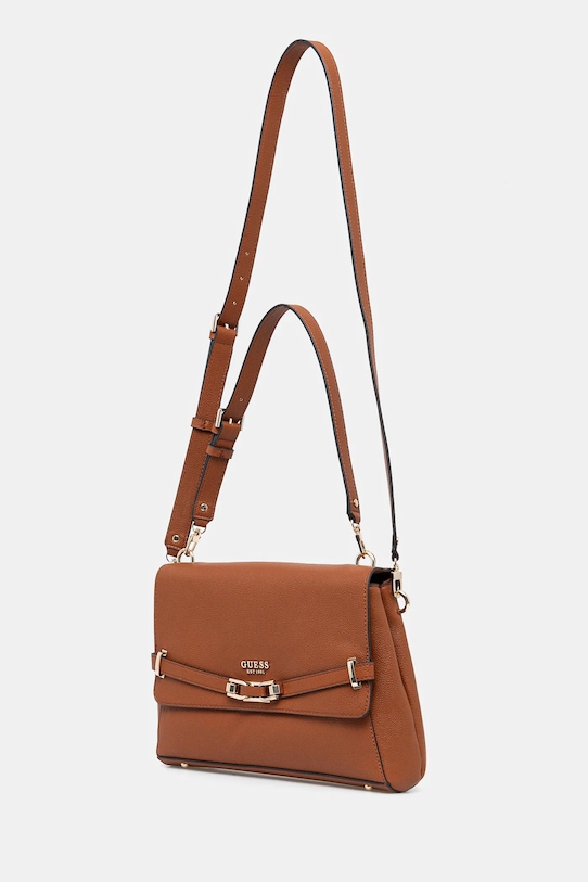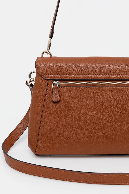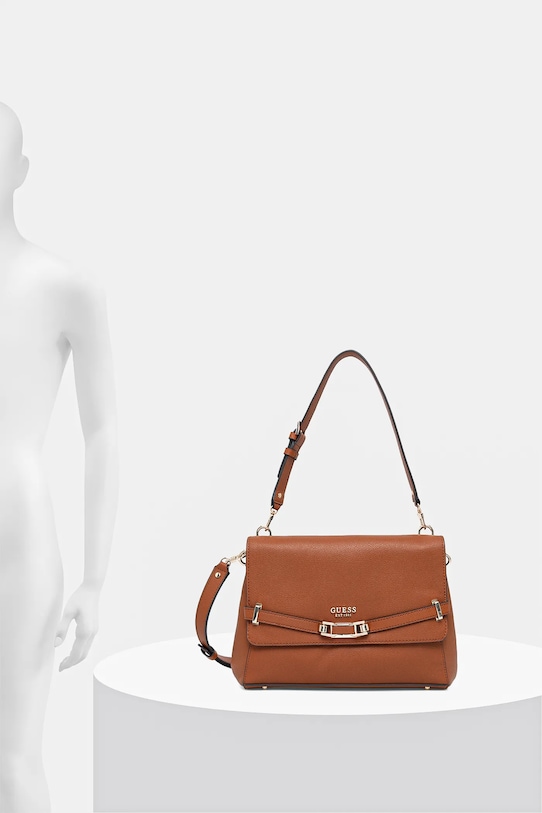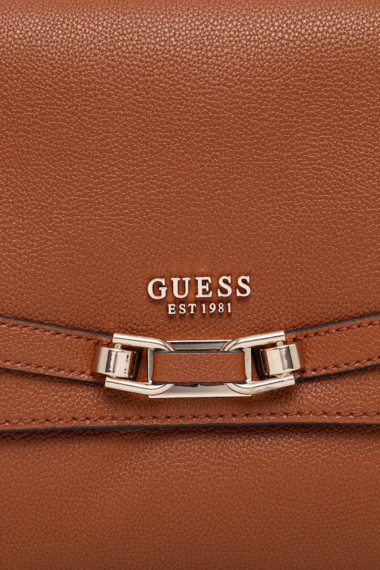 Сумка среднего размера из коллекции Guess. Модель на молнии, выполнена из экокожи. - Входящий в комплект тканевый чехол защищает изделие от пыли. - Клапан застегивается на магнит. - Имеет ручку и съемный регулируемый ремень. - Модель оснащена металлическими ножками, защищающими дно сумки. - Карман на молнии на задней стороне позволяет безопасно хранить телефон или другие мелкие предметы. - Имеет три отделения, одно из которых застегивается на молнию. - Два внутренних накладных кармана. - Внутренний карман на молнии. - Не подходит для формата А4. - Модель на подкладке. - Глубина: 7 см. - Высота: 21 см. - Ширина у основания: 30 см.