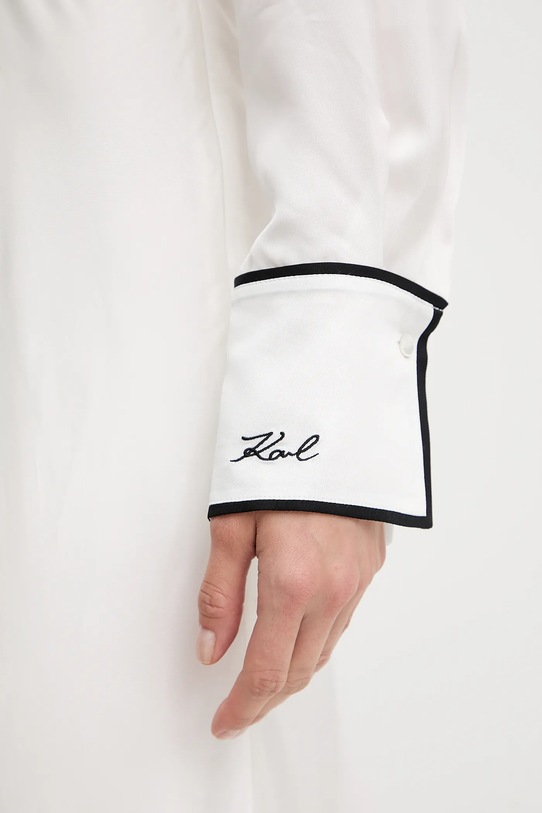 Это платье из коллекции Karl Lagerfeld выполнено из тонкой, неэластичной ткани. Модель выполнена из дышащего материала с высоким содержанием вискозы. - Модель длины миди. - Расклешенный крой. - Удобная застежка на кнопки позволяет легко надевать и снимать. - Манжеты на пуговицах. - Модель отделана декоративной окантовкой. - Длина: 120 см. - Ширина под мышками: 45 см. - Размеры указаны для размера: 36.
