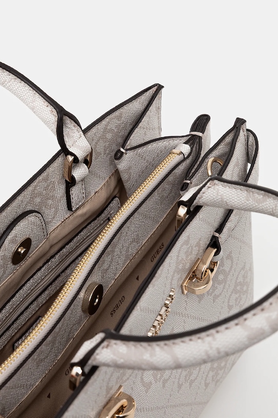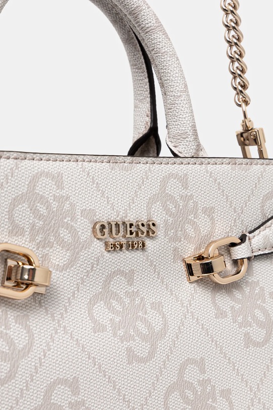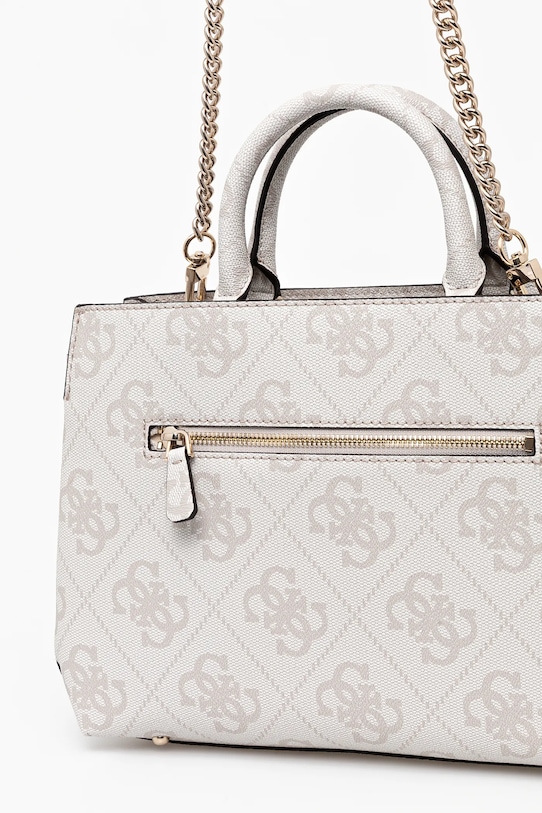 Небольшая сумочка из коллекции Guess. Модель на молнии, выполнена из экокожи. - Имеет три отделения. - Застежка-молния и магнитная застежка. - Модель на подкладке. - Карман на молнии на задней стороне позволяет безопасно хранить телефон или другие мелкие предметы. - Три внутренних кармана: один на молнии, два накладных. - Модель оснащена металлическими ножками, защищающими дно сумки. - Сумка для ношения в руке или на плече. - Имеет ручки и съемный нерегулируемый ремень. - Не подходит для формата А4. - Входящий в комплект тканевый чехол защищает изделие от пыли. - Глубина: 11 см. - Высота: 22 см. - Ширина у основания: 29 см.