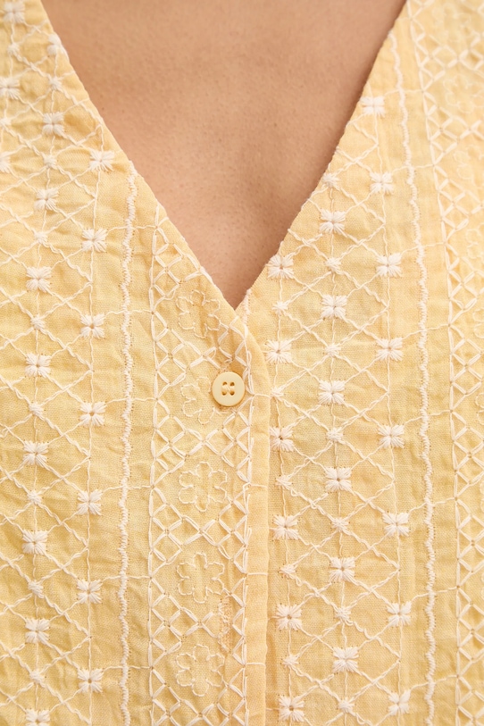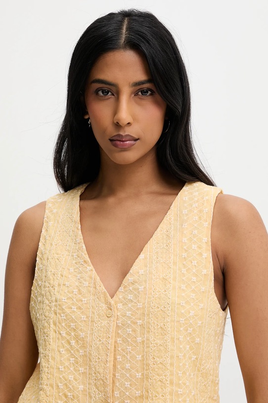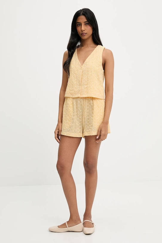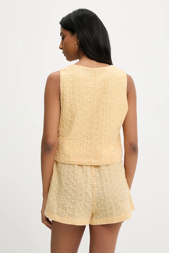 Жилет и шорты из коллекции Answear.LAB выполнены из тонкой, неэластичной ткани. Содержание полиэстера делает материал менее мнущимся. - Простой дизайн, не стесняющий движений. - Удобная застежка на кнопки позволяет легко надевать и снимать. - Широкий эластичный пояс. - Два боковых накладных кармана. - Повышенное состояние. - Модель с декоративной вышивкой. - Дополнительный слой материала в виде подкладки. - Длина: 46,5 см. - Ширина под мышками: 44 см. - Ширина талии: 35 см. - Ширина бедер: 51 см. - Высота талии: 35 см. - Ширина штанины: 35 см. - Длина внешней части штанины: 36 см. - Размеры указаны для размера: S.