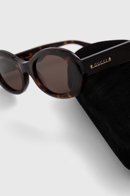Солнцезащитные очки из коллекции Gucci. Эта модель с гладкими линзами и пластиковой оправой имеет защиту UV 400. Полученный вами футляр может отличаться от изображенного на фотографии. Производитель отправляет футляры случайным образом, поэтому выбрать футляр невозможно. - Форма оправы: овальная. - Защита от ультрафиолета. - В комплект модели входят чехол и салфетка для протирки очков. - Категория 3 (пропускает 8–18% света) — самая распространённая и универсальная категория затемняющих фильтров. Очки категории 3 идеально подходят для повседневного использования в солнечные дни и для отдыха в жарких странах. - Ширина рамы: 145 мм. - Ширина линзы: 50 мм.
