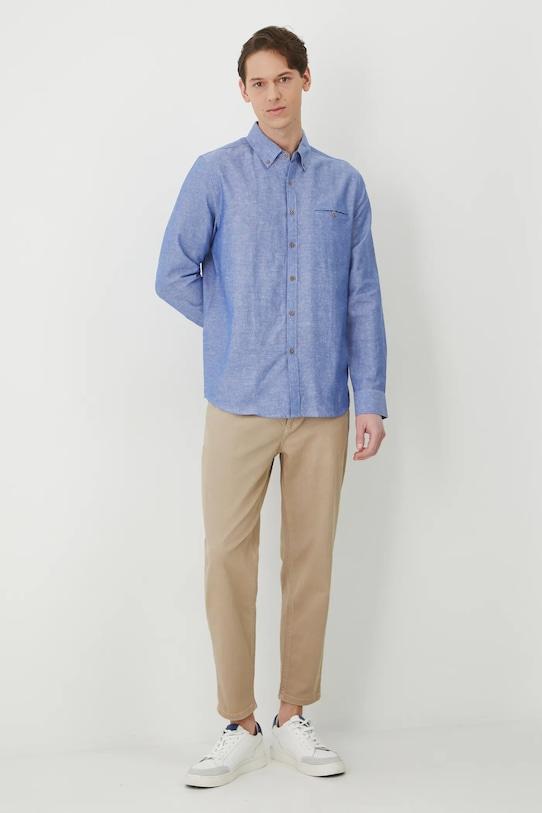 Эта рубашка из коллекции Medicine. Она сшита из смеси льна и хлопка. Воротник застёгивается на пуговицы. - Рубашка прямого кроя мягко облегает фигуру, но не подчеркивает ее, обеспечивая свободу движений. - Длинный рукав. - Манжеты на пуговицах. - Воротник на пуговицах. - Застежка на пуговицы. - Нагрудный карман застегивается на пуговицу. - Меланжевая ткань. - Модель выполнена из смеси льна и хлопка. - Льняной материал обеспечивает комфорт и воздухопроницаемость. - Окружность воротника: 43,5 см. - Длина рукава: 68 см. - Длина: 77,6 см. - Ширина груди: 57,5 см. - Ширина плеч: 47,5 см. - Размеры указаны для размера: L.