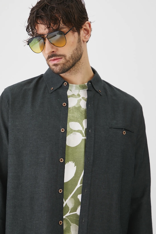 Эта рубашка из коллекции Medicine. Она сшита из смеси льна и хлопка. Воротник застёгивается на пуговицы. - Рубашка прямого кроя мягко облегает фигуру, но не подчеркивает ее, обеспечивая свободу движений. - Длинный рукав. - Манжеты на пуговицах. - Воротник на пуговицах. - Застежка на пуговицы. - Нагрудный карман застегивается на пуговицу. - Меланжевая ткань. - Модель выполнена из смеси льна и хлопка. - Льняной материал обеспечивает комфорт и воздухопроницаемость. - Окружность воротника: 43,5 см. - Длина рукава: 68 см. - Длина: 77,6 см. - Ширина груди: 57,5 см. - Ширина плеч: 47,5 см. - Размеры указаны для размера: L.