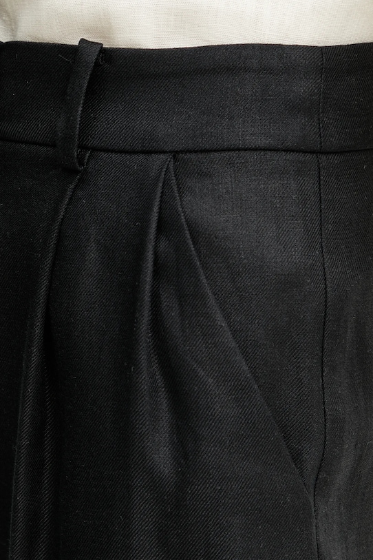 Брюки из коллекции Luisa Spagnoli из тонкой, неэластичной ткани. Модель выполнена из дышащего льняного материала. - Модель с высокой талией, застежкой на молнию, пуговицы и крючок. - Прямая нога. - Два боковых накладных кармана. - Декоративные закладки. - Ширина талии: 36 см. - Ширина бедер: 50 см. - Высота талии: 30 см. - Длина по внутреннему шву: 83 см. - Размеры указаны для размера: 40.