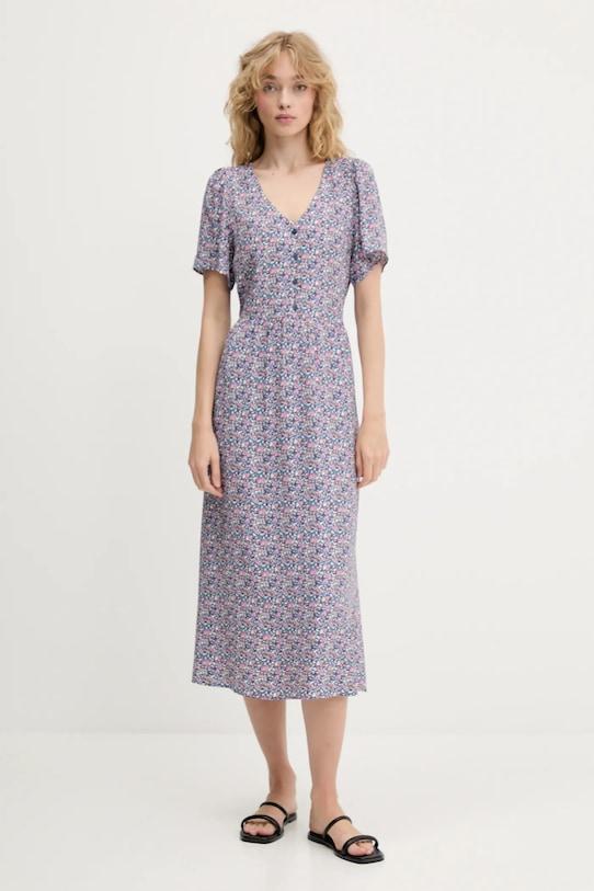 Это платье из коллекции Marc O'Polo выполнено из тонкой, неэластичной ткани. Модель выполнена из дышащего вискозного материала. - Изготовлено из экологически чистого материала LENZING ECOVERO. LENZING ECOVERO производится из органической целлюлозы и древесной массы, используя на 50% меньше воды, чем популярная вискоза. - Расклешенный крой. - Модель длины миди. - Короткий рукав. - Острый вырез. - Короткая планка с пуговицами. - Пояс на талии корректирует фигуру и еще больше подчеркивает талию. - Модель без подкладки. - Узорчатая ткань. - Длина: 122 см. - Ширина под мышками: 46 см. - Размеры указаны для размера: S.