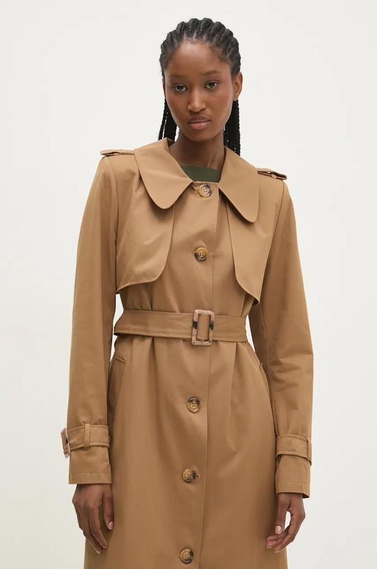 Тренч из коллекции Answear.LAB. Модель без подкладки выполнена из гладкой ткани. Содержание полиэстера делает материал менее мнущимся. - Простой дизайн, не стесняющий движений. - Дополнительный слой материала в виде подкладки. - Модель с воротником. - В плечах вшиты подкладки. - Погоны на плечах. - Текстильные полоски по низу рукавов. - Однобортный пиджак с застежкой на пуговицы. - Текстильный ремешок в комплекте. - Два боковых накладных кармана. - Тонкая, неэластичная ткань. - Длина рукава: 64 см. - Длина: 130 см. - Ширина под мышками: 50 см. - Ширина плеч: 38 см. - Размеры указаны для размера: S.