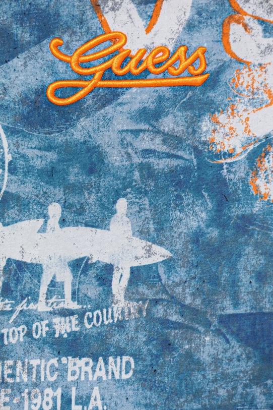 Этот детский комплект из коллекции Guess изготовлен из тонкой, эластичной ткани и дышащего хлопкового материала. - В состав продукта входят волокна органического хлопка, выращенного без использования вредных химикатов, химических пестицидов и искусственных удобрений. - Простой дизайн, не стесняющий движений. - Круглый ребристый вырез. - Короткий рукав. - Узорчатое трикотажное полотно. - Логотип бренда вышит спереди. - Свободные шорты в области бедер и ягодиц. - Эластичный пояс предотвращает скольжение во время движения. - Прямая нога полной длины. - Имитация карманов спереди. - Два накладных кармана на ягодицах.