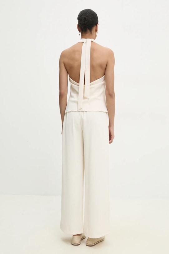 Блузка и брюки из коллекции Answear.LAB выполнены из гладкой ткани. Полиэстер обеспечивает повышенную устойчивость к сминанию. - Простой дизайн, не стесняющий движений. - Модель с водолазкой. - Модель с регулируемой шнуровкой. - Высокая талия с резинкой предотвращает скольжение во время движения. - Прямая нога полной длины. - Два боковых накладных кармана. - Длина: 55 см. - Ширина под мышками: 43 см. - Ширина талии: 35 см. - Ширина бедер: 49 см. - Высота талии: 32 см. - Ширина штанины внизу: 28 см. - Ширина штанины: 31 см. - Длина внешней части штанины: 97 см. - Размеры указаны для размера: S.