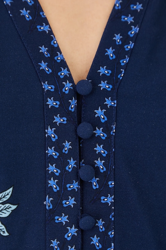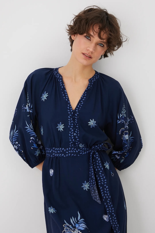 Платье из коллекции Medicine. Расклешенная модель из смесовой льняной ткани. - Материал с добавлением льна обеспечивает комфорт и воздухопроницаемость. - Расклешенный крой. - Рукав три четверти. - Рукав реглан. - Рукава отделаны резинкой. - Острый вырез. - Короткая планка с пуговицами. - Ремешок в комплекте. - Эластичный пояс. - Декоративные оборки. - Узорчатая ткань. - Узор с растительными и животными мотивами. - Модель макси длины. - Ширина талии (до растяжения): 33 см. - Ширина талии (после растяжения): 47 см. - Ширина груди: 48 см. - Длина: 129 см. - Размеры указаны для размера: S.