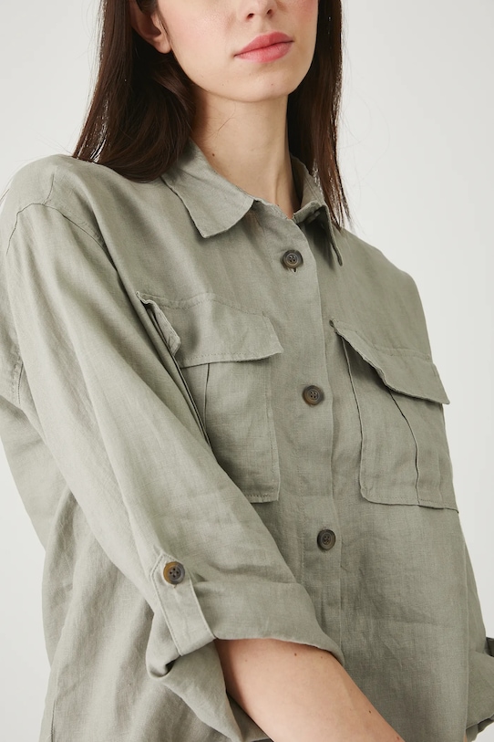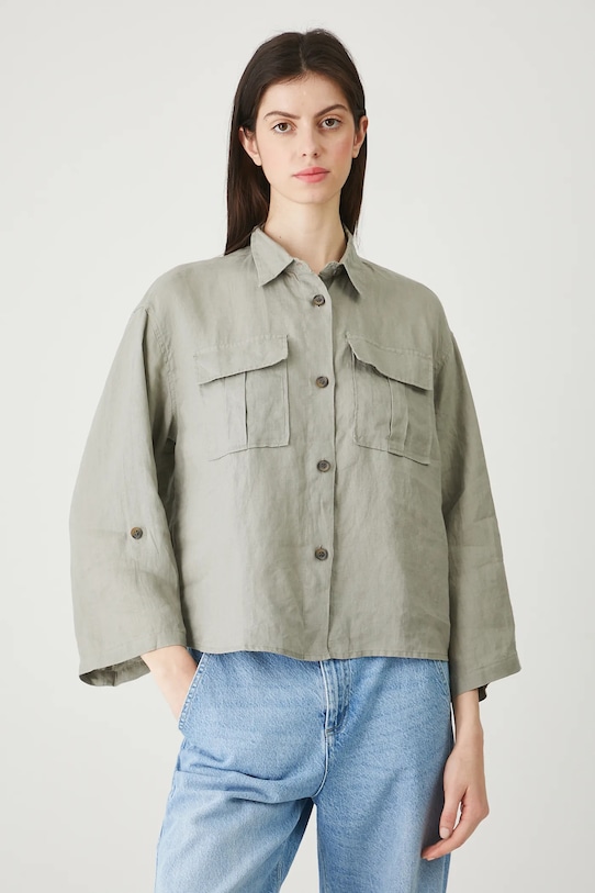 Рубашка из коллекции «Медицина». Изготовлена из льняной ткани, с воротником. - Материал с сертификатом OEKO-TEX Standard 100 гарантирует, что текстильные изделия, на которых он нанесен, не содержат вредных и потенциально опасных для человека и окружающей среды веществ. - Натуральный, воздушный и прочный материал, изготовлен из 100% льна. - Большой размер. - Рукав три четверти. - Пуговицы внизу рукавов для регулирования длины. - Модель с воротником. - Застежка на пуговицы. - Два накладных кармана с клапанами на груди. - Гладкая ткань. - Длина: 59,5 см. - Ширина груди: 57,5 см. - Размеры указаны для размера: S.