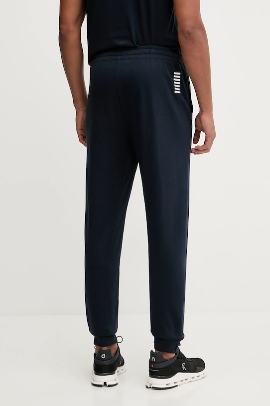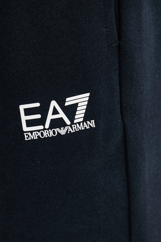 Спортивные брюки из коллекции EA7 Emporio Armani из принтованного трикотажа. Изготовлены из исключительно комфортного материала с высоким содержанием хлопка. - Высокая талия с эластичным поясом. - Регулировка ширины талии с помощью шнурков. - Ножки отделаны удобными эластичными манжетами. - Два накладных кармана спереди. - Крой с зауженными брючинами, не стесняющими движений. - Тонкий, эластичный трикотаж. - Ширина талии: 38 см. - Ширина бедер: 48 см. - Высота талии: 29 см. - Ширина штанины внизу: 12 см. - Ширина штанины: 27 см. - Длина внешней части штанины: 102 см. - Размеры указаны для размера: M.