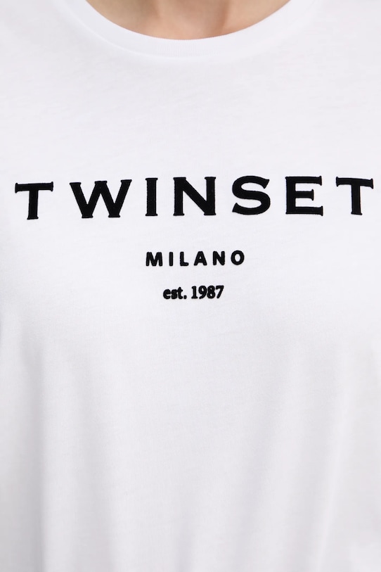 Эта футболка из коллекции Twinset выполнена из тонкой, эластичной ткани на основе дышащего хлопка. - Свободный крой, обеспечивающий полную свободу движений. - Круглый ребристый вырез. - Короткий рукав. - Крой рукава со спущенной линией плеча не ограничивает подвижность. - Модель с принтом спереди. - Длина: 67 см. - Ширина под мышками: 54 см. - Размеры указаны для размера: S.