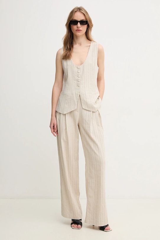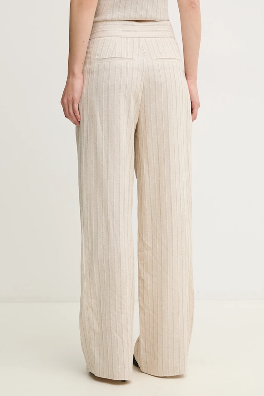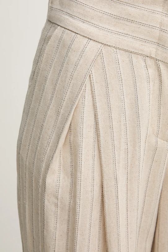 Брюки из коллекции Hoss Intropia из тонкой, неэластичной ткани. Модель выполнена из исключительно комфортного и высококачественного материала. - Брюки свободные в области бедер и ягодиц. - Прямая нога полной длины. - Модель с высокой талией, застежкой на молнию, пуговицы и крючок. - Два боковых накладных кармана. - Имитация карманов на ягодицах. - Декоративные закладки. - Материал с металлической нитью. - Ширина талии: 38 см. - Ширина бедер: 55 см. - Высота талии: 32 см. - Ширина штанины внизу: 28,5 см. - Ширина штанины: 32 см. - Длина внешнего шва: 112 см. - Размеры указаны для размера: S.