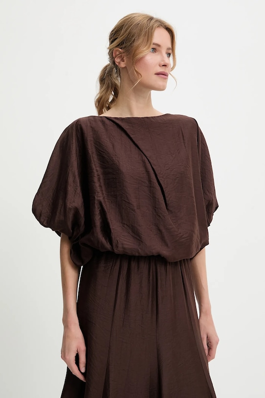 Эта блузка из коллекции Answear.LAB выполнена из тонкой, неэластичной ткани. Модель выполнена из исключительно комфортного материала с высоким содержанием лиоцелла. - Частично изготовлен из лиоцелла — экологичного и нетоксичного материала. Этот материал мягкий и дышащий, идеально подходит для чувствительной кожи, склонной к раздражению. - Свободный крой, обеспечивающий полную свободу движений. - Короткие, пышные рукава. - Вырез горловины «лодочка». - Застегивается на пуговицы сзади. - Дополнительный слой материала в виде подкладки. - Длина: 46 см. - Ширина под мышками: 58 см. - Размеры указаны для размера: S.