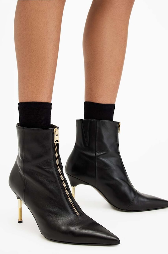 Ботильоны из коллекции AllSaints. Модель выполнена из натуральной кожи и имеет кожаную подкладку, которая обеспечивает комфорт и предотвращает натирание, потертости и появление неприятного запаха. - Эта модель изготовлена в соответствии с рекомендациями Leather Working Group, которая сертифицирует кожевенные заводы посредством строгих аудитов. Эти усилия направлены на снижение потребления энергии и воды при дублении кожи, а также на устранение загрязнения сточных вод. - Заостренный, жесткий нос. - Усиленный задник обеспечивает отличную поддержку лодыжки и пятки. - Застежка-молния. - Кожаный салон. - Модель на шпильке.
