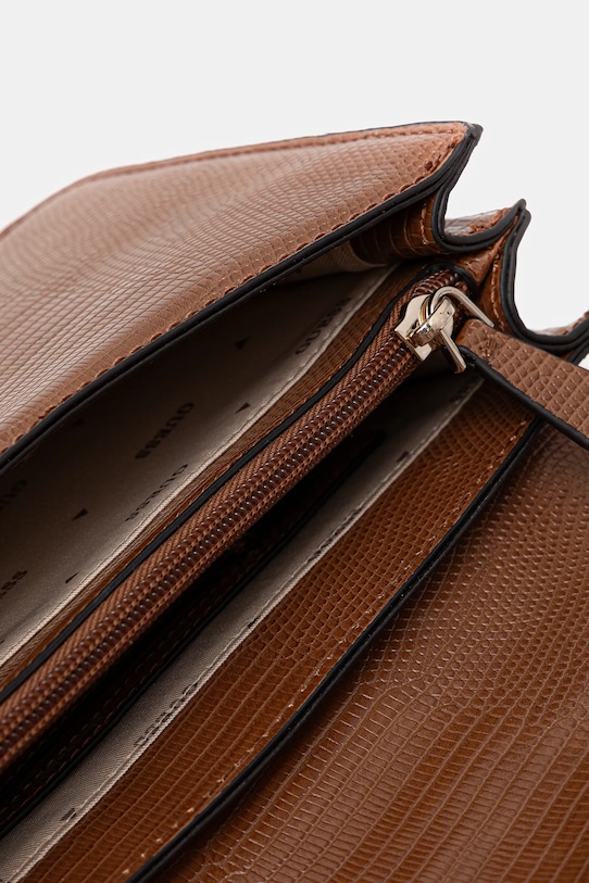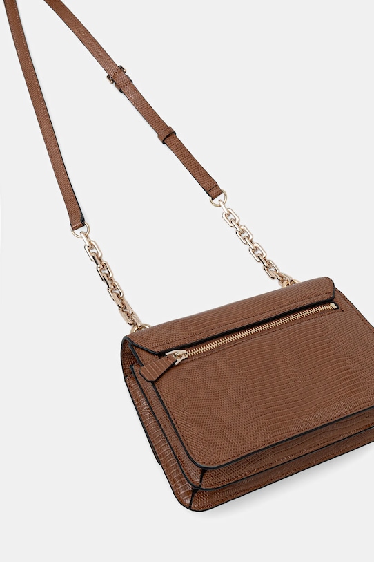 Небольшая сумочка из коллекции Guess. Модель на молнии, выполнена из экокожи. - Клапан застегивается на магнит. - Имеет три отделения, одно из которых застегивается на молнию. - Имеет внутренний карман на молнии и отделения для карт. - Карман на молнии на задней стороне позволяет безопасно хранить телефон или другие мелкие предметы. - Не подходит для формата А4. - Несъемный, регулируемый ремешок. - Входящий в комплект тканевый чехол защищает изделие от пыли. - Минимальная длина ремешка: 102 см. - Максимальная длина ремня: 114 см. - Глубина: 7 см. - Высота: 16 см. - Ширина у основания: 22 см.