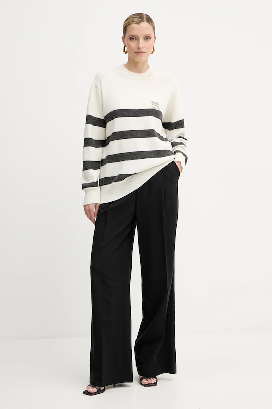 Этот свитер из коллекции Ermanno Scervino выполнен из эластичного трикотажа средней плотности. Высокие терморегулирующие свойства шерсти позволяют сохранять тепло в холод и прохладу в жару. - Свободный крой, обеспечивающий полную свободу движений. - Круглый ребристый вырез. - Длинный рукав. - Крой рукава со спущенной линией плеча не ограничивает подвижность. - Рукава и низ изделия отделаны манжетами для защиты от неблагоприятных погодных условий. - Модель с декоративной аппликацией. - Длина рукава (от горловины): 75 см. - Длина: 70 см. - Ширина под мышками: 60 см. - Размеры указаны для размера: 36.