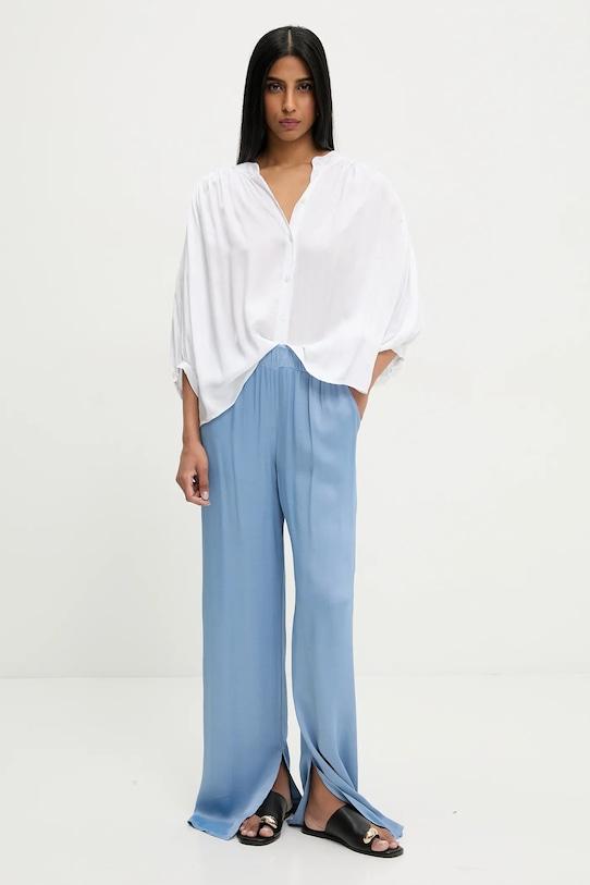 Брюки из коллекции Answear.LAB из тонкой, неэластичной ткани. Модель выполнена из нежного, дышащего материала, идеально подходящего для теплого времени года. - Брюки свободные в области бедер и ягодиц. - Прямая нога полной длины. - Высокая талия с резинкой предотвращает скольжение во время движения. - Разрезы внизу штанин. - Два боковых накладных кармана. - Модель выполнена из материала атласного переплетения. - Ширина талии: 33 см. - Ширина бедер: 51 см. - Высота талии: 31 см. - Ширина штанины внизу: 26 см. - Ширина штанины: 30 см. - Длина внешнего шва: 114 см. - Указаны размеры: S/M.