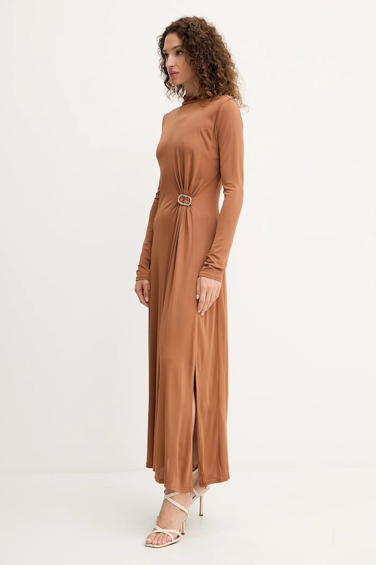 Это платье из коллекции Twinset выполнено из тонкого эластичного трикотажа. Модель выполнена из дышащего вискозного материала. - Простой дизайн, не стесняющий движений. - Модель с воротником-стойкой. - Застегивается на пуговицы сзади. - У него есть щель. - Длина рукава: 70 см. - Длина: 150 см. - Ширина под мышками: 40 см. - Размеры указаны для размера: 36.