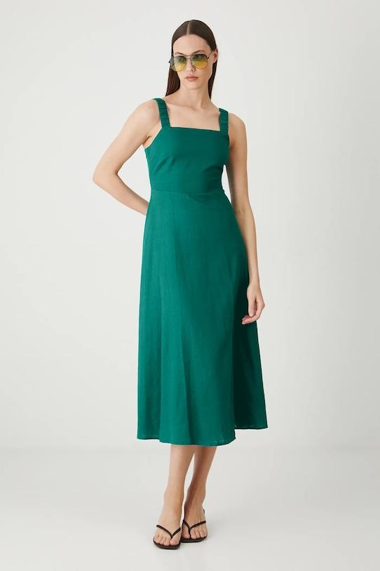 Платье из коллекции «Медицина». Расклешенная модель из смеси льна и вискозы. - Льняной материал обеспечивает комфорт и воздухопроницаемость. - Расклешенный крой. - Модель без бретелек. - Эластичные ремни обеспечивают индивидуальную посадку. - Алмазный вырез. - Застежка-молния. - Эластичная резинка сзади. - Декоративная шнуровка сзади. - У него есть щель. - Гладкая ткань. - Модель длины миди. - Ширина талии (до растягивания): 35 см. - Ширина талии (в растянутом виде): 38 см. - Ширина бедер: 54 см. - Ширина груди: 43 см. - Длина: 126 см. - Размеры указаны для размера: S.