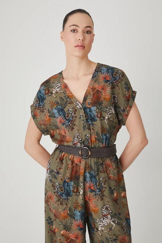 Комбинезон из коллекции «Медицина». Модель с коротким рукавом, выполнена из узорчатой ткани. - Обычная посадка. - Короткие рукава кимоно. - Острый вырез. - Застежка на пуговицы. - В комплект входит плетеный ремешок. - Эластичный пояс. - Широкие штанины. - Узорчатая ткань. - Узор с растительными и животными мотивами. - Ширина талии (до растягивания): 32 см. - Ширина талии (в растянутом виде): 48,5 см. - Ширина бедер: 57 см. - Высота талии: 33 см. - Ширина штанины внизу: 35 см. - Длина по внутреннему шву: 78,5 см. - Ширина груди: 59 см. - Размеры указаны для размера: S.