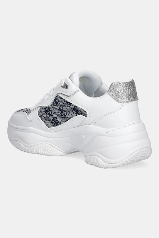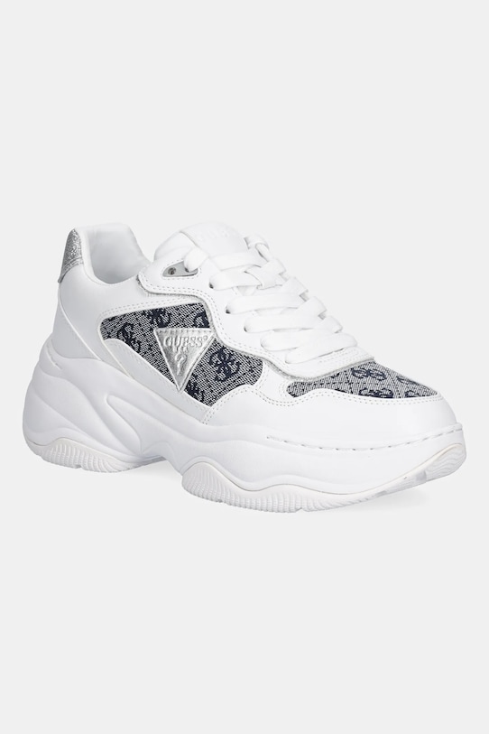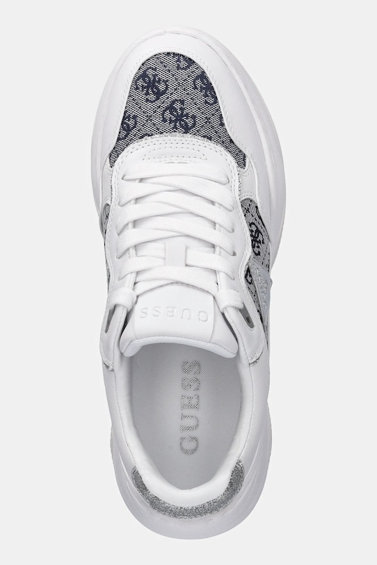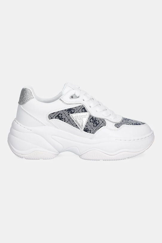 Эти кроссовки из коллекции Guess изготовлены из комбинации экокожи и текстиля. Усиленный верх обеспечивает устойчивость. - Круглый, слегка утолщенный носок. - Жесткий задник стабилизирует пятку и удерживает ногу в обуви, не давая ей выскальзывать во время движения. - Резиновая рифленая подошва долговечна и обеспечивает хорошее сцепление. - Пенная промежуточная подошва обеспечивает более мягкое ощущение и дополнительную амортизацию. - Платформенная модель. - Съемную вставку легко чистить и обновлять. - Классическая шнуровка позволяет индивидуально подогнать обувь по ноге. - Высота платформы: 6,5 см.