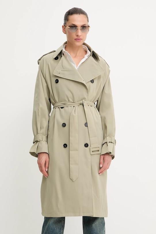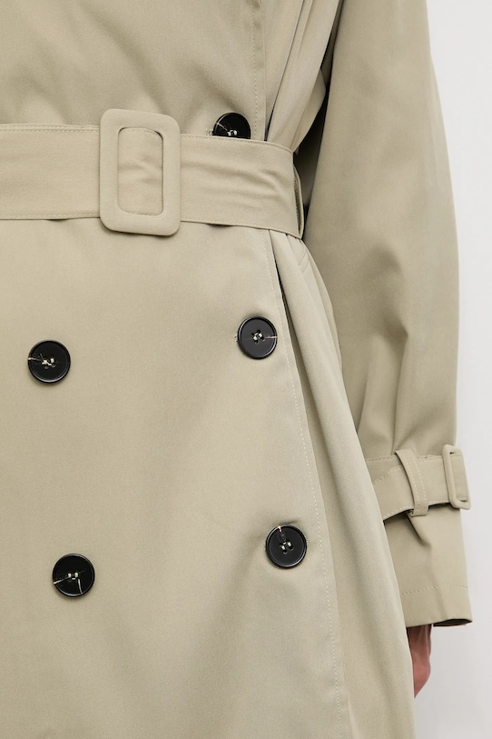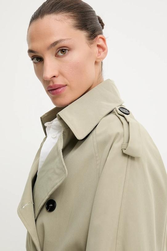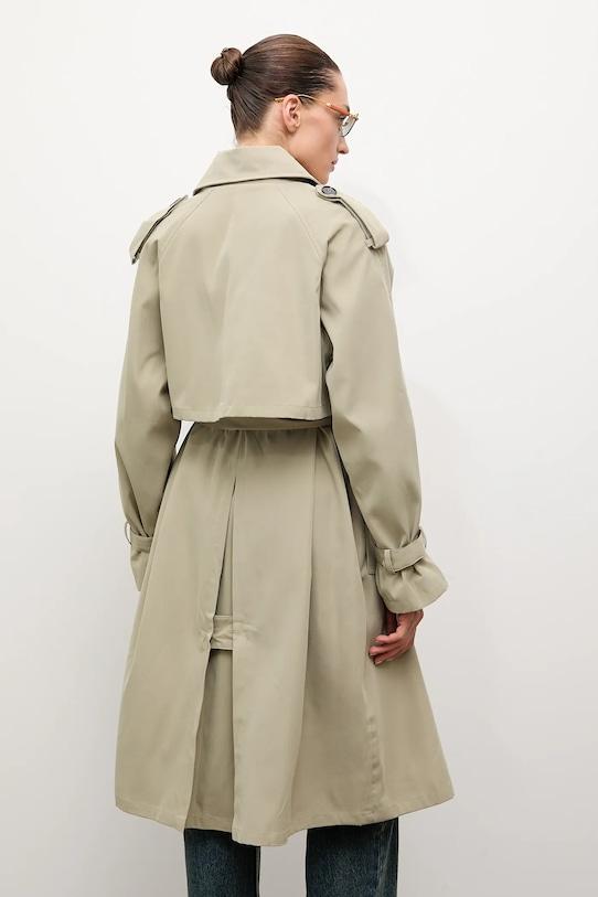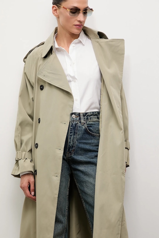 Тренч из коллекции Answear.LAB. Эта модель без подкладки выполнена из гладкой ткани. Коллекция доступна эксклюзивно на Answear.com. - Простой дизайн, не стесняющий движений. - Рукава реглан благодаря своей конструкции обеспечивают большую свободу движений. - Двубортный пиджак с застежкой на пуговицы. - Модель с воротником. - Внешние накладные карманы. - Пояс на талии корректирует фигуру и еще больше подчеркивает талию. - Погоны на плечах. - Неутепленная модель с подкладкой. - Длина рукава (от воротника): 75 см. - Длина: 106 см. - Ширина под мышками: 56 см. - Указаны размеры: S/M.