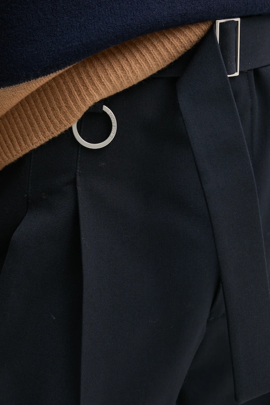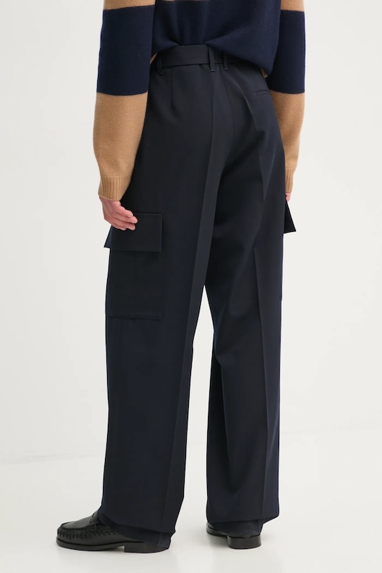 Брюки из коллекции Études Studio из гладкой ткани. Высокие терморегулирующие свойства шерсти позволяют согреться в холод и охладиться в жару. - Застежка на молнию, пуговицы и крючок. - Два накладных кармана спереди. - Карманы для груза обеспечивают дополнительное место для хранения мелких предметов. - Ножки отутюжены до складок. - Тонкая, неэластичная ткань. - Текстильный ремешок в комплекте. - Ширина талии: 40 см. - Ширина бедер: 50 см. - Высота талии: 33 см. - Ширина штанины внизу: 21 см. - Ширина штанины: 32 см. - Длина внешнего шва: 115 см. - Размеры указаны для размера: 48.