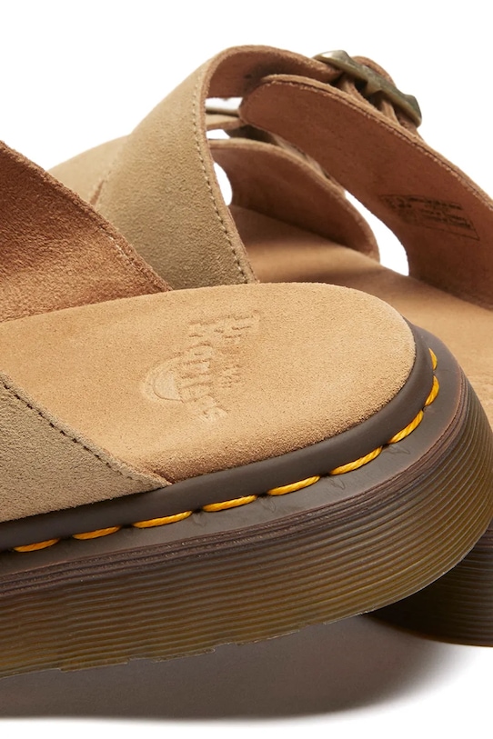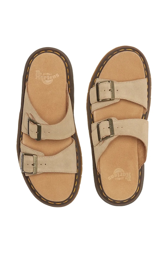 Шлёпанцы из коллекции Dr. Martens. Изготовлены из замши и оснащены кожаной подкладкой, которая обеспечивает комфорт и предотвращает натирание, потертости и появление неприятного запаха. - Гладкий материал. - Застежка на две пряжки со штифтом для индивидуальной посадки. - Кожаная обивка комфортна для ног и предотвращает появление неприятных запахов. - Амортизирующая стелька из пеноматериала EVA. Верх и подошва изготовлены по технологии Goodyear. Между ними расположена полоска материала, сваренная и прошитая, что обеспечивает водонепроницаемость. - Резиновая подошва прочная и устойчивая к повреждениям.