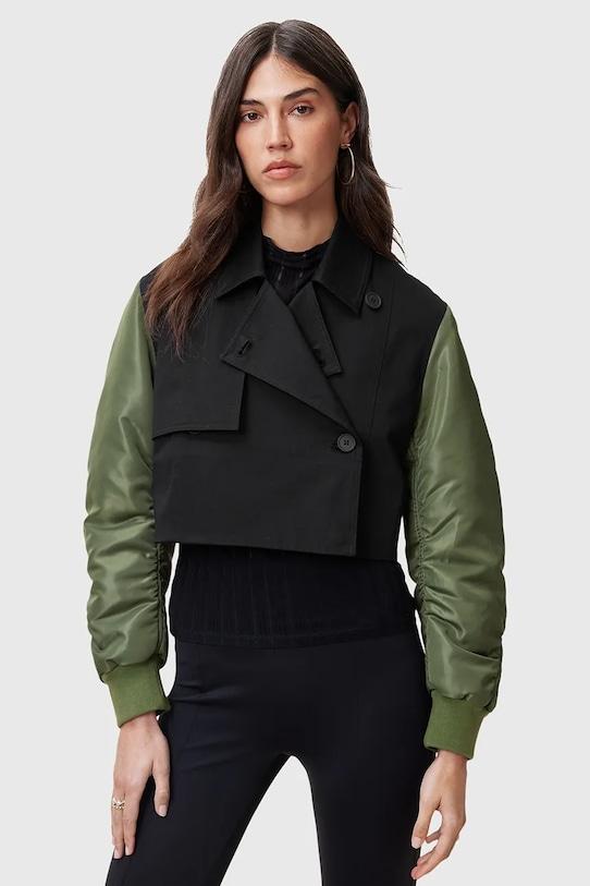 Куртка-бомбер из коллекции AllSaints. Эта модель с лёгким утеплителем выполнена из гладкой ткани. Исключительно комфортный материал с высоким содержанием хлопка. - Органический хлопок выращивается без использования вредных химикатов, химических пестицидов и искусственных удобрений. - Изделие содержит переработанные волокнистые материалы. - Модель 2-в-1 - имеет отстегивающуюся нижнюю часть, поэтому ее можно носить как тренчкот или бомбер. - Двубортный пиджак с застежкой на пуговицы. - Рукава отделаны манжетами для защиты от неблагоприятных погодных условий. - Классические лацканы. - Пояс на талии.