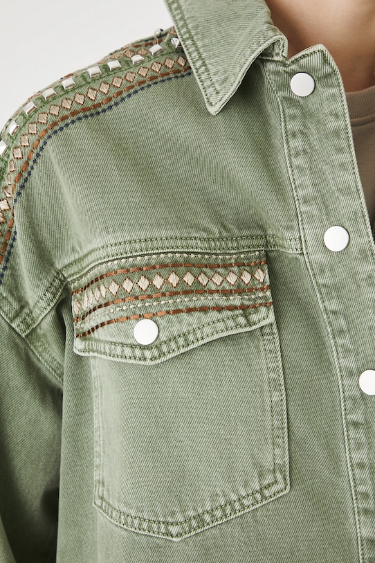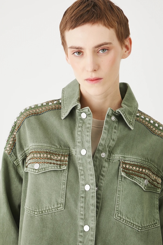 Куртка-рубашка из коллекции Medicine. Модель без подкладки выполнена из хлопкового денима. - Большой размер. - Длинный рукав. - Заниженная линия плеча. - Рукава застегиваются на кнопки. - Модель с воротником. - Застежка-кнопка. - Два нагрудных кармана с застежкой на кнопку. - Джинсовая ткань с эффектом потертости. - Модель с декоративной вышивкой. - Вышивки с растительными и животными мотивами. - Модель со шпильками. - Неутепленная модель без подкладки. - Длина рукава (от воротника): 71,5 см. - Длина: 71 см. - Ширина груди: 64 см. - Размеры указаны для размера: S.