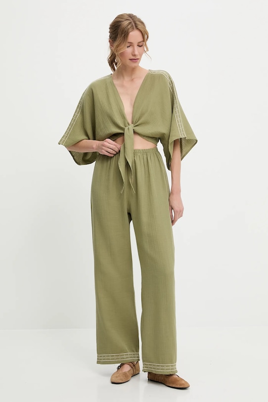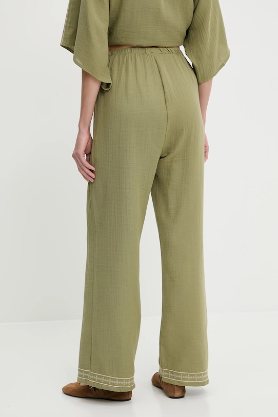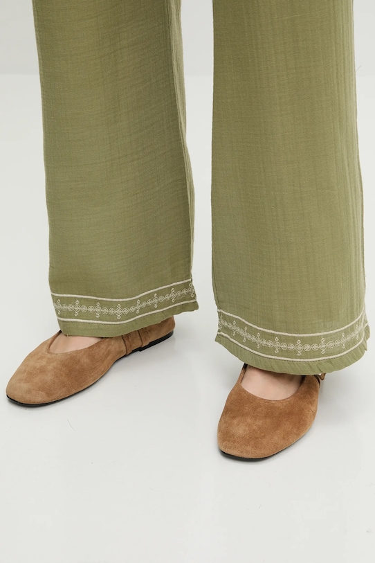 Брюки из коллекции Answear.LAB из тонкой, слегка эластичной ткани. Изготовлены из дышащего хлопка. - Брюки свободные в области бедер и ягодиц. - Высокая талия обеспечивает комфорт во время занятий спортом и позволяет визуально стройнить фигуру. - Эластичный пояс предотвращает скольжение во время движения. - Декоративная шнуровка спереди. - Прямая нога полной длины. - Модель с декоративной вышивкой. - Ширина талии: 35 см. - Ширина бедер: 55 см. - Высота талии: 34 см. - Длина по внутреннему шву: 74 см. - Длина внешней части штанины: 104 см. - Размеры указаны для размера: S.