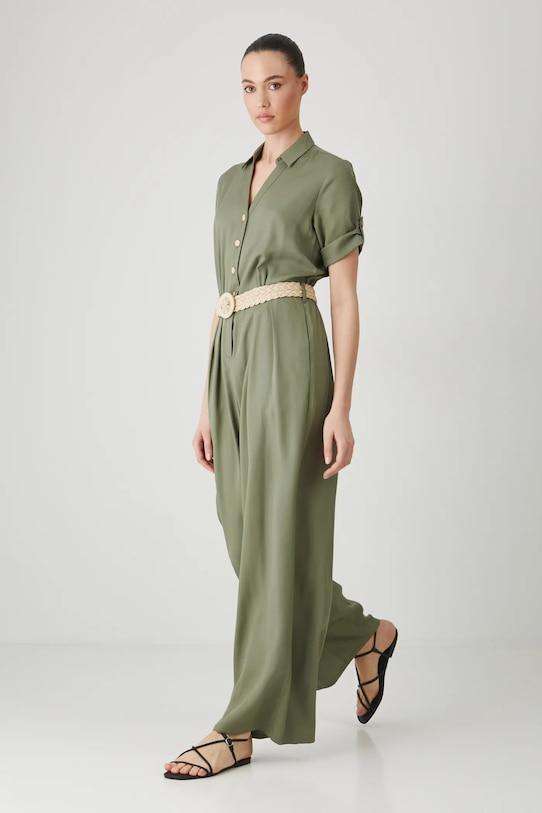 Комбинезон из коллекции «Медицина». Модель с короткими рукавами выполнена из гладкой ткани. - Простой дизайн. - Короткий рукав. - Острый вырез с воротником. - Застежка на пуговицы. - Декоративные закладки. - Эластичный пояс. - В комплект входит плетеный ремешок. - Широкие штанины. - Гладкая ткань. - Модель изготовлена из лиоцелла. - Ширина груди: 51,4 см. - Ширина талии (до растягивания): 45 см. - Ширина талии (в растянутом виде): 33 см. - Ширина бедер: 59,5 см. - Высота талии: 32 см. - Длина по внутреннему шву: 76,5 см. - Размеры указаны для размера: S.